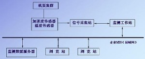 系統(tǒng)是一種分布式網(wǎng)絡(luò)型遠(yuǎn)程數(shù)據(jù)采集分析系統(tǒng)。其中,現(xiàn)場(chǎng)信號(hào)采集站安裝在現(xiàn)場(chǎng),每個(gè)現(xiàn)場(chǎng)信號(hào)采集站負(fù)責(zé)采集多臺(tái)機(jī)泵的振動(dòng)和溫度信號(hào)。現(xiàn)場(chǎng)信號(hào)采集站與監(jiān)測(cè)工作站之間采用網(wǎng)絡(luò)形式通訊,采用TCP/IP通信協(xié)議,可以遠(yuǎn)距離通暢傳輸數(shù)據(jù)。系統(tǒng)現(xiàn)場(chǎng)信號(hào)采集站數(shù)量不限,數(shù)據(jù)傳輸速率最高可達(dá)10M/100MBbps,用來(lái)傳輸系統(tǒng)設(shè)置信息、測(cè)量信號(hào)數(shù)據(jù)、波形、信號(hào)報(bào)警信息等。監(jiān)測(cè)工作站可以通過(guò)企業(yè)MIS網(wǎng),實(shí)現(xiàn)機(jī)泵運(yùn)行數(shù)據(jù)的網(wǎng)上共享,相關(guān)部門和人員都可以使用網(wǎng)絡(luò)瀏覽器觀察現(xiàn)場(chǎng)機(jī)泵的運(yùn)行數(shù)據(jù)。