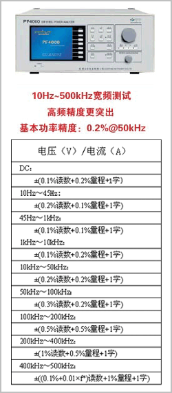 PF4000功率分析儀可解決10Hz~500kHz電信號(hào)的精確測(cè)量,采用DSP高速采樣、低失真寬帶取樣、信號(hào)實(shí)時(shí)分析、PLL鎖相環(huán)同步,線性濾波,過零濾波等國(guó)際先進(jìn)技術(shù),保證各種非周期波及高頻信號(hào)的精確測(cè)量,大屏幕液晶顯示所有測(cè)試數(shù)據(jù)與波形,無需電腦即可獨(dú)立工作。10Hz~500kHz寬頻測(cè)試,高頻精度更突出,功率基本精度為0.2%@50kHz。