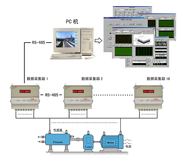 HY-1000 設(shè)備狀態(tài)在線監(jiān)測(cè)系統(tǒng)是根據(jù)工礦企業(yè)對(duì)設(shè)備進(jìn)行連續(xù)監(jiān)測(cè)的需求,結(jié)合我公司在這一領(lǐng)域多年的實(shí)踐經(jīng)驗(yàn),專門開發(fā)的設(shè)備在線狀態(tài)監(jiān)測(cè)系統(tǒng),它具有安裝方便、使用靈活、性價(jià)比高的特點(diǎn)。其典型系統(tǒng)組成是以一臺(tái)高性能工業(yè)計(jì)算機(jī)為管理主機(jī),采用RS-485通訊總線,與設(shè)備現(xiàn)場(chǎng)安裝的HY-107八通道狀態(tài)監(jiān)測(cè)數(shù)據(jù)采集儀(最多可達(dá)16臺(tái),128通道)聯(lián)機(jī),實(shí)現(xiàn)數(shù)據(jù)交換?,F(xiàn)場(chǎng)數(shù)據(jù)采集儀實(shí)現(xiàn)對(duì)傳感器輸入信號(hào)的調(diào)理及采樣,可就近安裝于需監(jiān)測(cè)的大型設(shè)備旁,系統(tǒng)布線簡(jiǎn)潔。系統(tǒng)配備以數(shù)據(jù)庫為核心的狀態(tài)監(jiān)測(cè)、分析和管理軟件(V1.0),具有很強(qiáng)的數(shù)據(jù)管理及分析功能,為企業(yè)關(guān)鍵設(shè)備的運(yùn)行維護(hù)提供了一種靈活、方便、可靠的現(xiàn)場(chǎng)解決方案。