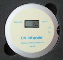 UV能量計( UV-Int150+ ): UV-int150+耐高溫UV能量計是一種高質量的UV能量測量儀。UV能量計是用于測量UV固化裝置的UV能量的一種儀器,測量儀的主感器在測量儀的背面,測量范圍為250~410納米,測量時可直接顯示于能量計正面的顯示屏上讀出(單位:毫焦耳/平方厘米),該能量計的電源為3.6伏特殊耐高溫125度電池,該電池由于使用了特別的能源節(jié)省線路,該電池可持續(xù)大約5000小時。