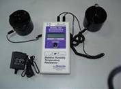 三、表面對地電阻測量(RTG) (Surface-To-Ground Resistance Measurement (RTG)) 這個測量方法是用于測量物體表面一點與表面上另一接地點之間的表面電阻,測量方法符合EOS/ESD S4.1測量標準。 A、將兩條連線的一端分別插入表的兩個3.5毫米插孔,然后將其中一條接鱷魚夾,另外一條與一個5磅重盤形探頭相聯(lián)。 B、將鱷魚夾子接到所知的接地點上,按照測量要求將盤形探頭放在待測物體表面上。 C、按下測量按鈕直至電阻(單位為歐姆)、相對濕度、溫度值顯示在顯示屏上,測量結(jié)果符合EIA,EOS/ESD,ANSI,IEC-93,CECC,ASTM測量標準,對于高阻抗材料的測量時為保證測得高精度測量結(jié)果,需注意不要使兩引線交疊,不要用手接觸探頭,引線和被測物體。 ACL-800兆歐表面阻抗表的校準步驟 1、范圍為103到1012具有精度1%的阻抗電橋。高精度相對濕度表(Relative Humidity Hygrometer)高精度溫度表(High accuracy Thermometer) 2、打開表蓋,小心切莫損傷電路板上兩條連接電源開關(guān)的導線。 3、找到電路板右下方三個校正調(diào)節(jié)器(Calibration Pots) 4、使表在這一環(huán)境條件下起碼1/2小時,取得自平衡后才可開始測試。 5、采用ACL-800表自帶的連接線一端連接上鱷魚夾,另一端香蕉插頭。 6、將3.5毫米長的插頭插入表的插口。 7、用鱷魚夾連接電阻器兩端。 8、三個校正調(diào)節(jié)器,最上面的為“濕度”測量,中間的為“阻抗”,最下面的為“溫度用小號螺絲刀調(diào)節(jié)”。順時針方向為增加值調(diào)節(jié),逆時針方向為降低值調(diào)節(jié)。 9、按下電源開關(guān),同時比較“溫度”,“濕度”和“電阻”值。 10、釋放電源開關(guān),并慢慢調(diào)節(jié)相應的校正調(diào)節(jié)器。 11、再次按下電源開關(guān),觀察LCD顯示屏。 12、如需要再校準,可再按下電源開關(guān)和調(diào)節(jié)校正器。 13、蓋上表蓋并將四個固定螺絲上緊。 14、按下電源開關(guān)確定表是否工作正常。