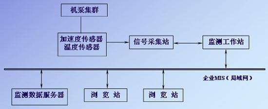系統(tǒng)是一種分布式網(wǎng)絡(luò)型遠(yuǎn)程數(shù)據(jù)采集分析系統(tǒng)。其中,現(xiàn)場(chǎng)信號(hào)采集站安裝在現(xiàn)場(chǎng),每個(gè)現(xiàn)場(chǎng)信號(hào)采集站負(fù)責(zé)采集多臺(tái)機(jī)泵的振動(dòng)和溫度信號(hào)。現(xiàn)場(chǎng)信號(hào)采集站與監(jiān)測(cè)工作站之間采用網(wǎng)絡(luò)形式通訊,采用TCP/IP通信協(xié)議,可以遠(yuǎn)距離通暢傳輸數(shù)據(jù)。系統(tǒng)現(xiàn)場(chǎng)信號(hào)采集站數(shù)量不限,數(shù)據(jù)傳輸速率最高可達(dá)10M/100MBbps,用來(lái)傳輸系統(tǒng)設(shè)置信息、測(cè)量信號(hào)數(shù)據(jù)、波形、信號(hào)報(bào)警信息等。監(jiān)測(cè)工作站可以通過(guò)企業(yè)MIS網(wǎng),實(shí)現(xiàn)機(jī)泵運(yùn)行數(shù)據(jù)的網(wǎng)上共享,相關(guān)部門和人員都可以使用網(wǎng)絡(luò)瀏覽器觀察現(xiàn)場(chǎng)機(jī)泵的運(yùn)行數(shù)據(jù)。
