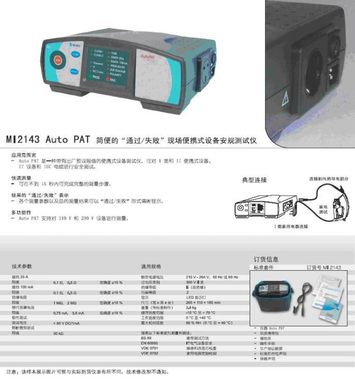- 關(guān)鍵參數(shù):MI2143現(xiàn)場(chǎng)便攜式設(shè)備安規(guī)測(cè)試儀,應(yīng)用范圍寬,可對(duì)I類和II便攜式設(shè)備、IT設(shè)備和IEC電纜進(jìn)行安全測(cè)試??稍诓坏?15 秒內(nèi)可完成完整的測(cè)量步驟,各個(gè)測(cè)量參數(shù)以及總的測(cè)量結(jié)果可以“通過(guò) / 失敗”形式清晰顯示。支持對(duì) 110 V 和 230 V 設(shè)備進(jìn)行測(cè)量。