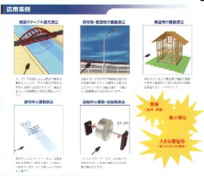 斜拉橋纜索、電桿或照明柱、車輛經(jīng)過時(shí)橋梁振動(dòng)狀況、比常規(guī)探頭還小的電子零件微小振動(dòng)測(cè)定、機(jī)械振動(dòng)、住宅和建筑物測(cè)量(同時(shí)測(cè)定縱擺動(dòng)及橫擺動(dòng))